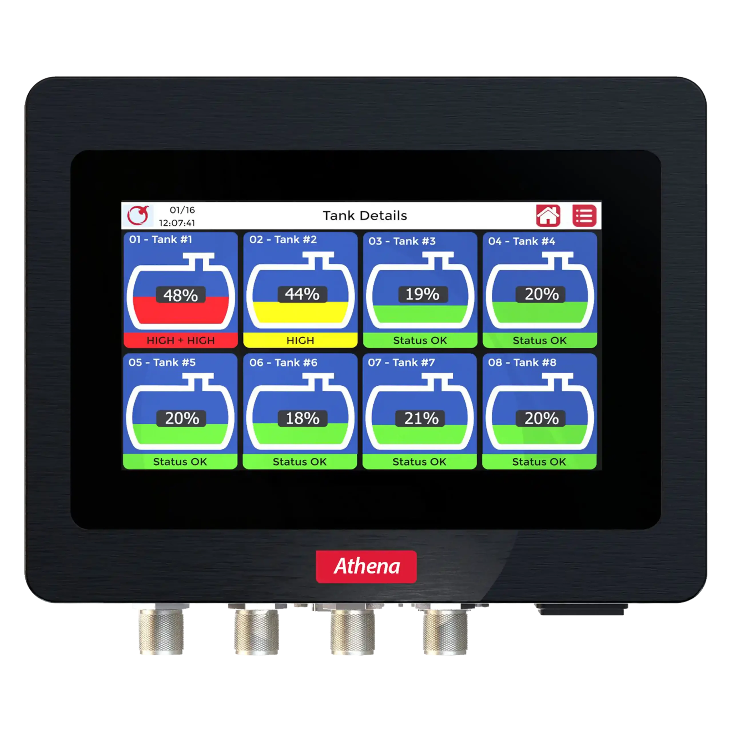 ATHENA is a compact and reliable stock management console designed to control up to 16 tanks with precision and efficiency. Powered by a Cortex ARM-M4 processor and equipped with a 7” TFT touchscreen display, it provides real-time monitoring of product level, water presence, volume, temperature, and ullage. With automatic recording of deliveries, trends, events, and alarms, plus web connectivity for remote configuration, ATHENA ensures complete operational control within a robust and scalable system architecture.